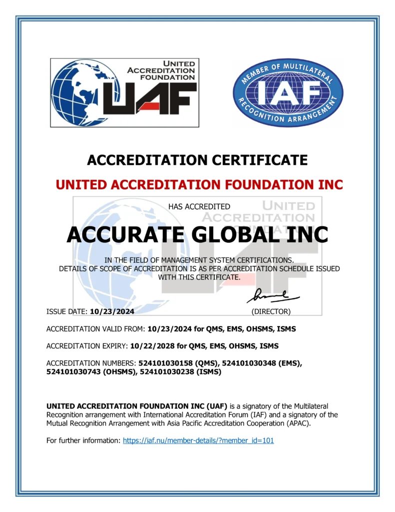 We are accredited by United Accreditation Foundation (UAF) as a Management System Certification Body under ISO/IEC 17021 Requirements for bodies providing audit and certification of management systems. This confirms that we, as a certification body, work at the highest level of ethical, legal, and technical standards.